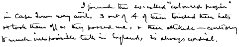 [I found the so-called "coloured people" in Cape Town very civil, 3 out of 4 of them touched their hats or took them off as they passed me, & their attitude contrary to much irresponsible talk in England, is always cordial.]