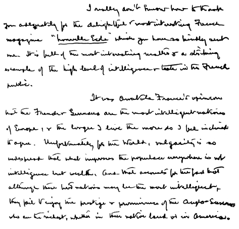 It was Anatole France's opinion that the French & Germans are the most intelligent nations of Europe, & the longer I live the more do I feel inclined to agree. Unfortunately for the World, vulgarity is so widespread that what impresses the populace everywhere is not intelligence but wealth. And that accounts for the fact that although these two nations may be the most intelligent, they fail to enjoy the prestige & prominence of the Anglo-Saxons who are the richest, whether in their native land or in America.] |