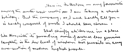 What chiefly strikes me in a place like this, with its prevailing noise of more or less genuine laughter, is the low level of wisdom that prevails in any cross-section of modern English people.] |